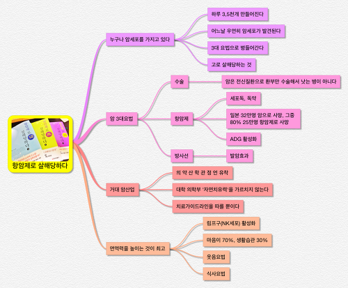 이 책에서 말하는 내용을 내 나름대로 종합해 보자면, '누구나 암세포는 몸 속에 가지고 있는 것이므로 병원에서 암진단을 받더라도 조급해하지 말고 병원치료는 멀리하며 내 몸 안에 있는 자연치유력을 극대화시켜 극복하자'는 것이다.
