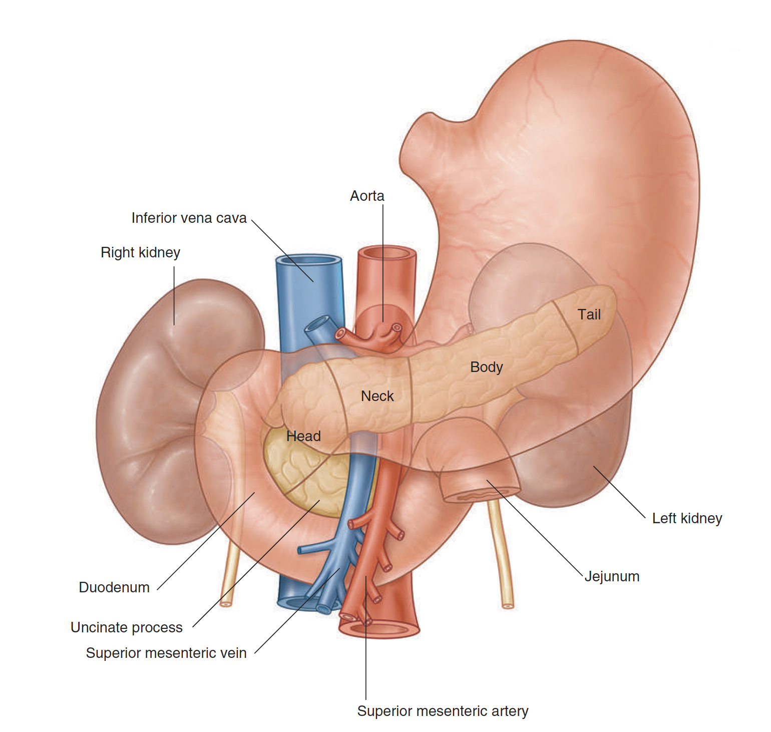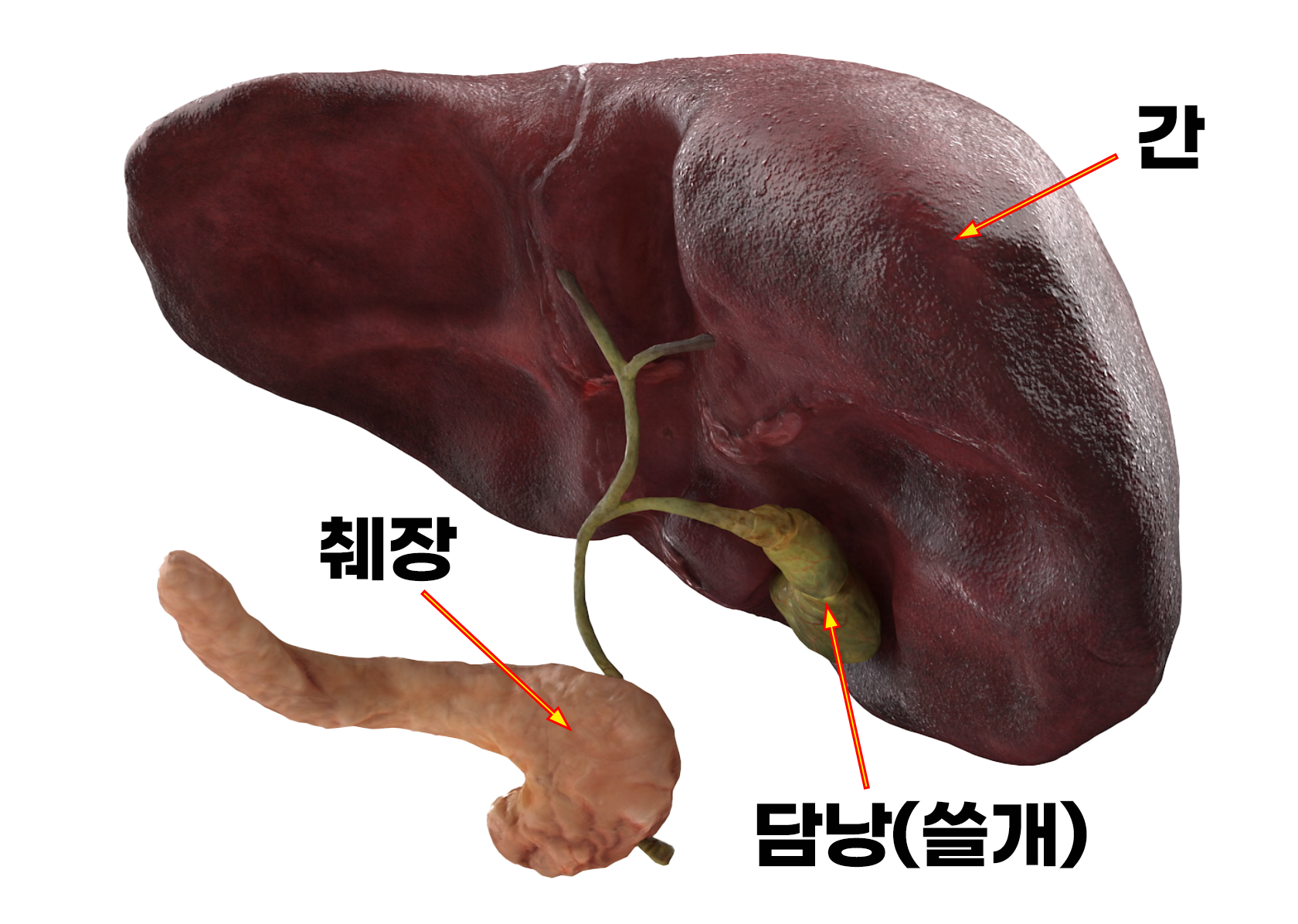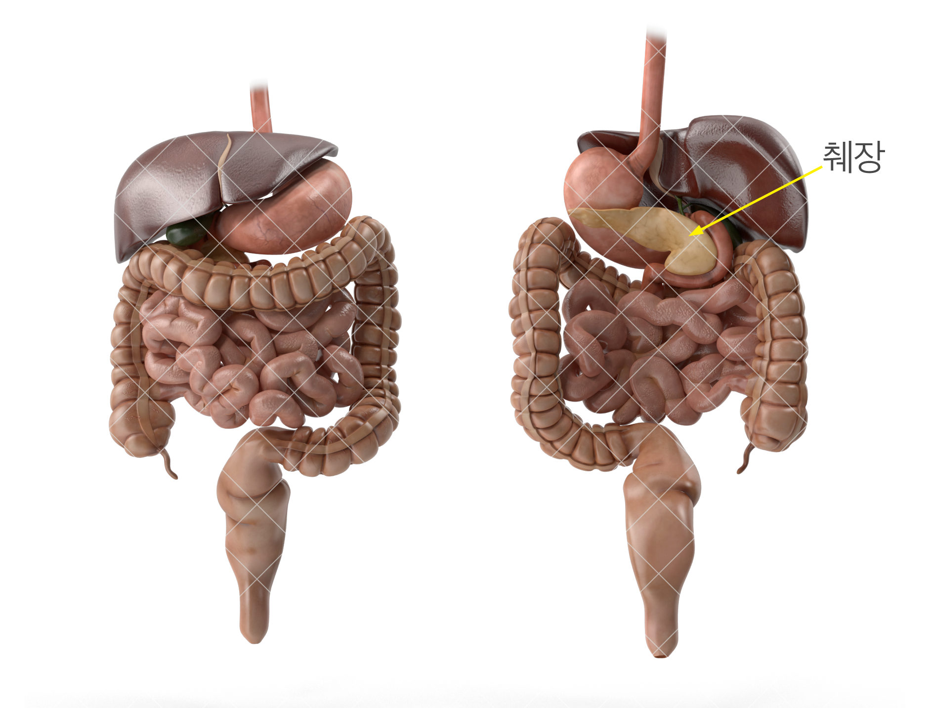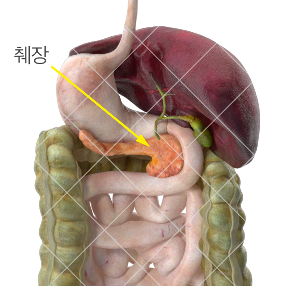 이자(胰子)라고도 하며, 명치끝과 배꼽 사이 상복부에 위치한 소화기관으로서 약 15㎝(100g 정도)의 가늘고 긴 형태를 가집니다. 위장의 뒤쪽에 위치하며 후복막 장기로 머리 부위는 십이지장과 연결되어 있고 꼬리 부위는 비장과 연결되어 있습니다.