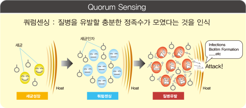 쿼럼센싱(Quorum Sensing)’이란 미생물이 환경에 순응하기 위해 스스로 상호작용인자를 분비하고, 이 분비된 인자를 다른 미생물이 인식하는 현상을 말한다. 현재까지 밝혀진 쿼럼으로 오토인듀서-1(AI-1)과 오토인듀서-2(AI-2)가 있다. 오토인듀서는 미생물 생존에 필수적인 에너지 대사과정의 산물로써 생장 환경의 영양 상태에 따라 합성하거나 바깥으로 분비해 미생물 간의 상호작용을 유발한다. 이러한 상호작용은 미생물의 운동성을 조절해 바이오필름 형성을 유도하거나(대부분의 미생물) 억제한다(콜레라균).