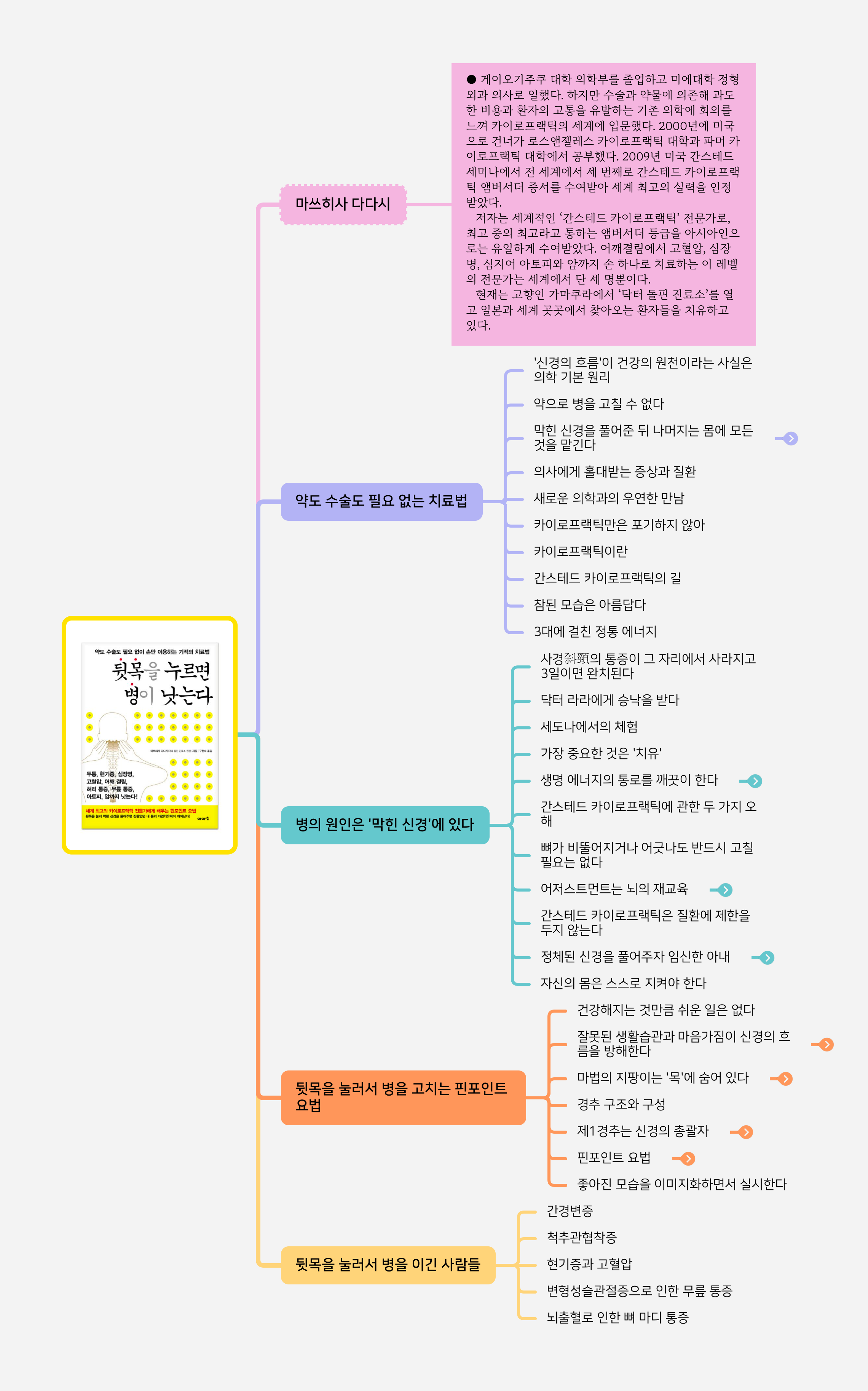 10년차 정형외과 의사로 일하다 한계를 느끼고 미국에서 카이로프랙틱 대학을 최우수로 졸업한 일본인. 그 여정이 책 내용의 반이고 나머지 반은 카이로프랙틱 소개와 자신이 직접 간소화한 방법인 핀포인트 요법을 소개한다.