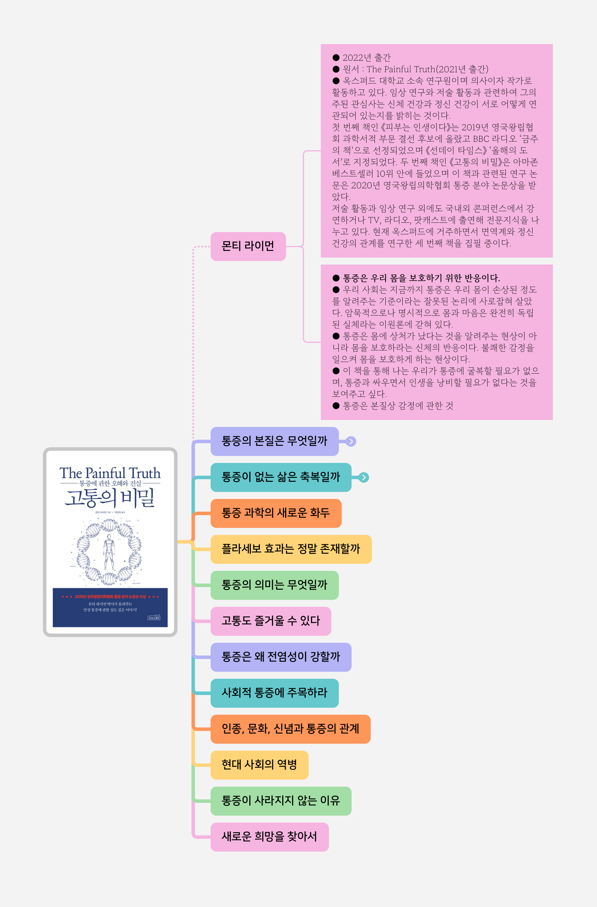● 우리 사회는 지금까지 통증은 우리 몸이 손상된 정도를 알려주는 기준이라는 잘못된 논리에 사로잡혀 살았다. 암묵적으로나 명시적으로 몸과 마음은 완전히 독립된 실체라는 이원론에 갇혀 있다.