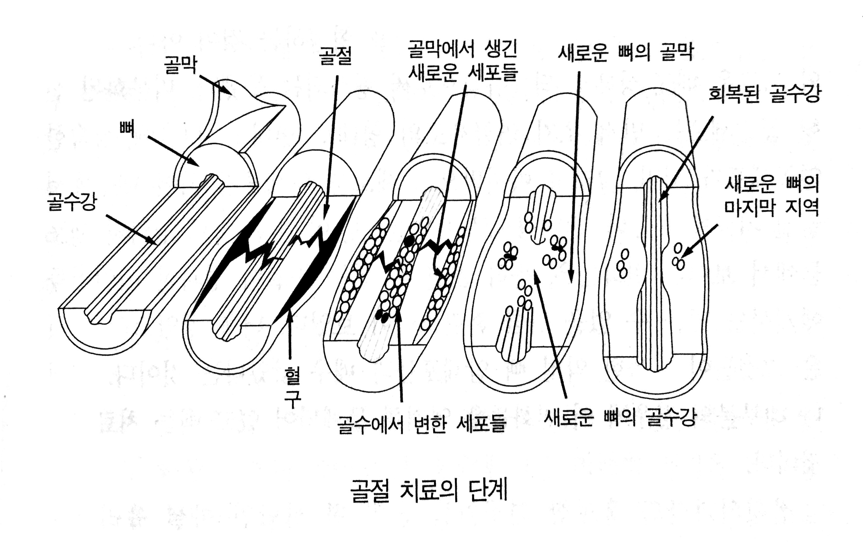 또 하나의 수리 작업은 뼈 내부의 빈 공간인 골수강에서 이루어진다. 유년기에 이 골수강 속의 골수는 백혈구와 적혈구로 구성되어 왕성하게 만들어지다가, 청장년기에 와서 대부분 지방질로 변한다. 반면에, 약간의 활동적인 세포들은 다공질의 내부 표면에 남게 된다. 골절 주변에서 골수로부터 새로운 조직이 형성되는데, 어린아이들이나 새끼 동물들에서는 훨씬 빨리 진행된다. 이 새로운 조직은 분화되지 않은 상태였는데, 골수세포들이 칼러스를 만드는 골막세포에서처럼 그 분열 속도를 증가시켜 그것을 형성하는 것이 아니고, 원시의 새로운 배胚 상태로 되돌아감으로써 형성되는 듯했다. 미분화된 선행 골수세포는 먼저 초기 연골세포의 형태로 변하고, 다음에 성숙한 연골세포가 되며 마지막으로 새로운 뼈세포가 되어 내부에서 골절 치료를 돕는다. 현미경으로 보았을 때, 이 내부 치료 영역의 세포들에서 보이는 변화들은, 특히 골절 후 한두 주일이 경과한 어린이들에게서는 믿을 수 없을 만큼 혼란스러워 보였다. 더욱 경악스러운 것은 그것들이 지독한 악성 뼈 암세포들과 매우 닮았다는 것이다. 그러나 대부분의 경우에 이 변화들은 엄격히 통제되어 있고 뼈는 치료되는 것이다.