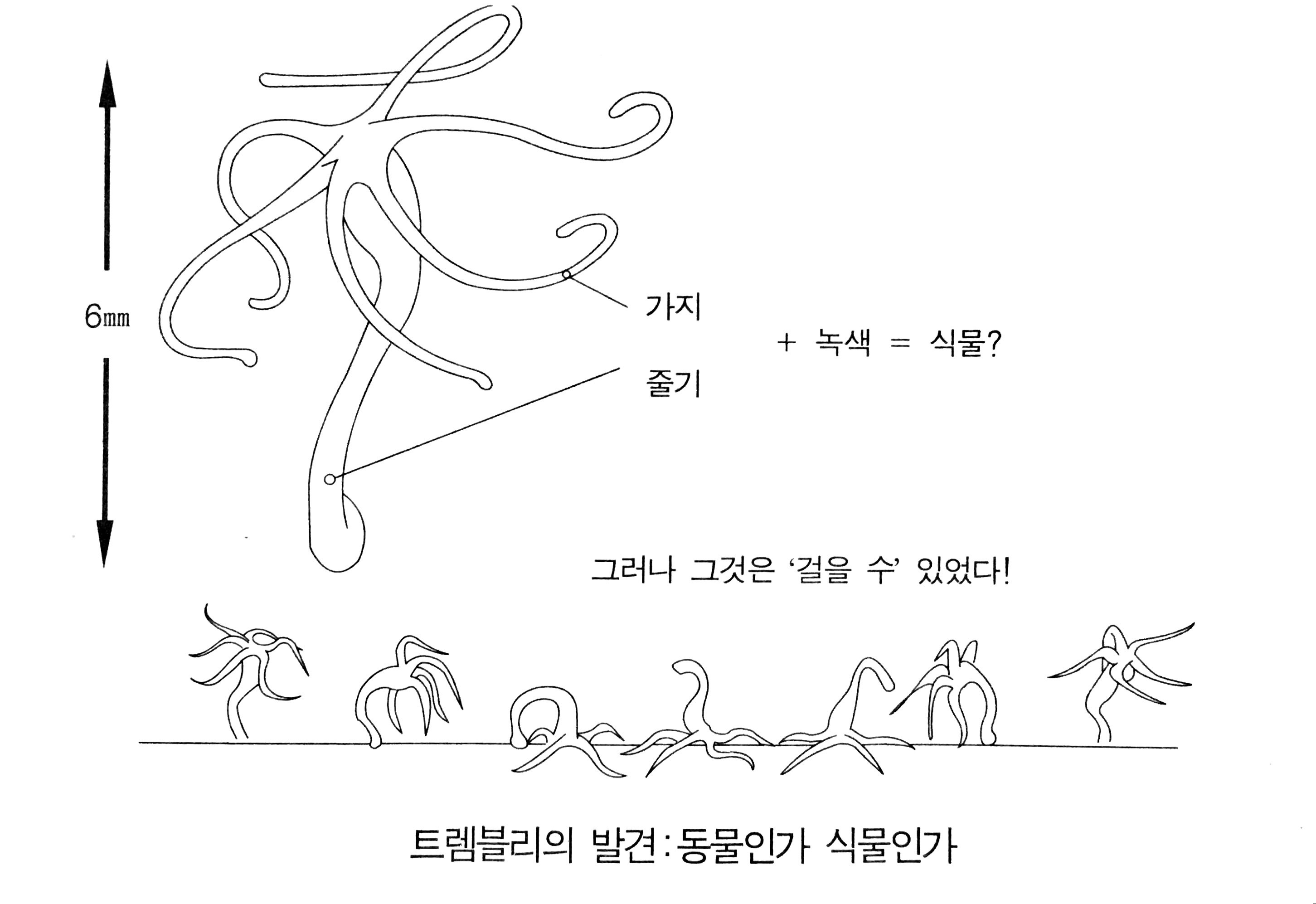 만약에 트렘블리가, 공생하고 있는 해조류 때문에 녹색을 띠고 있는 한 종족을 발견한 적이 없었다면, 그는 움직이는 능력을 가진 그것들을 동물로 가정하고 다른 관찰로 나아갔을 것이다. 그는 동물인지 식물인지의 문제를 해결하기 위해 그것들을 반으로 잘라 보기로 했다. 만약에 재성장한다면 그것들은 걷는다는 비정상적인 능력을 가진 식물이며, 만약에 재성장할 수 없다면 녹색 동물임에 틀림없는 것이다.