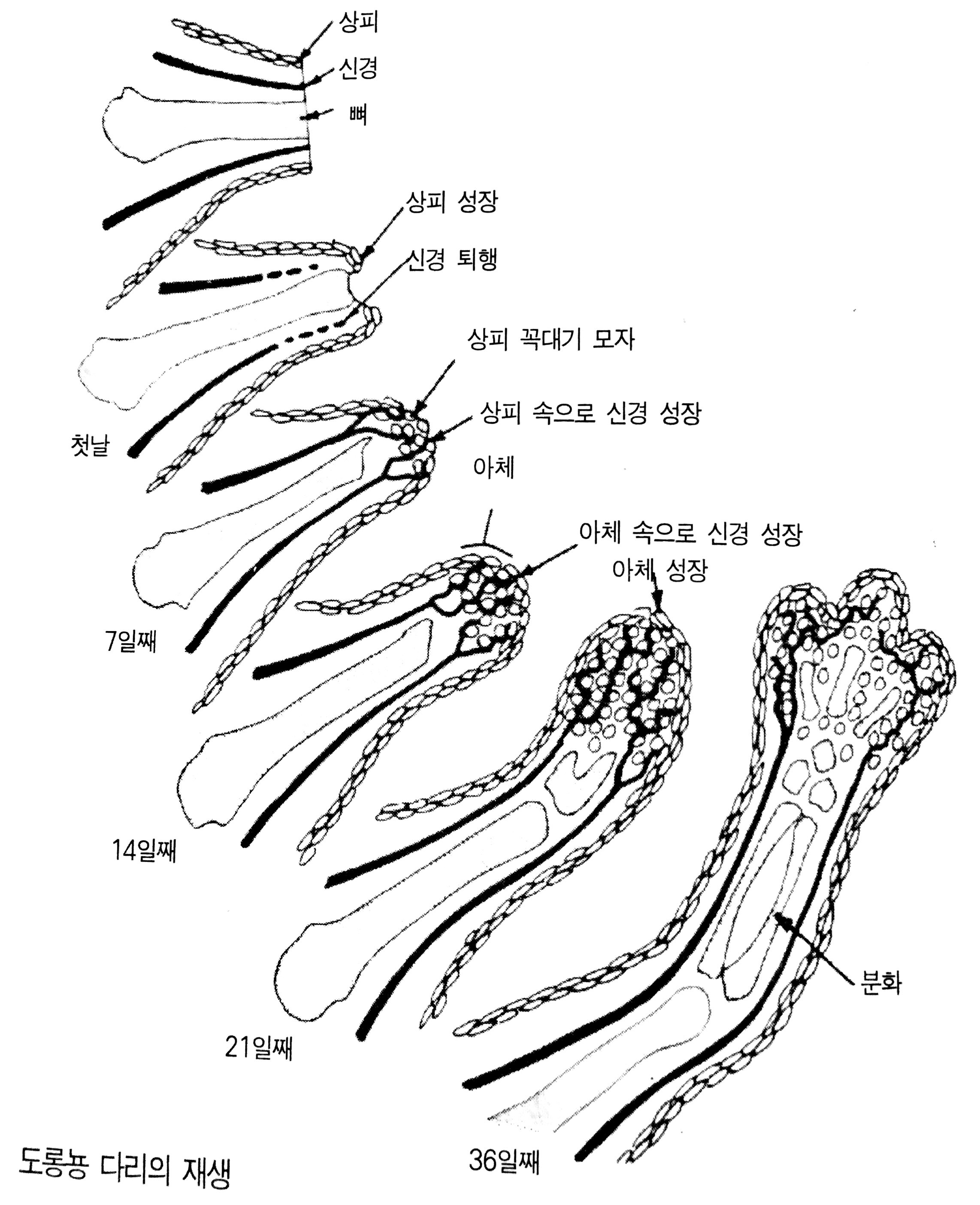 아체는 약 2주일 내에 마련된다. 아체가 형성되는 동안에도 그것의 바깥 가장자리에서는 급속한 세포분열이 일어나서 아체의 모양을 원뿔이 되게 하고 성장에 필요한 새로운 세포들의 안정된 공급원 역할을 한다. 약 3주 후에, 아체세포들 안쪽 가장자리에서 세포들은 특정한 모양으로 분화하면서 그들 자신을 조직으로 배열시키기 시작하는데, 뼈축 주위에 연골 고리를 형성하는 것으로 시작한다. 다음에 다른 조직들이 형성되고, 그리고 새로운 다리가 마치 안개 속에서 나오는 것처럼 보이기 시작한다. 다음에 다른 조직들이 형성되고, 새로운 다리가 마치 안개 속에서 나오는 것처럼 보이기 시작한다. 다리의 모릎 아래 위가 결합하고, 약 8주 후 네 개의 발가락이 다시 나타나면 재생은 완성된 것이다(약간 크기가 커지는 점만 달라진다).