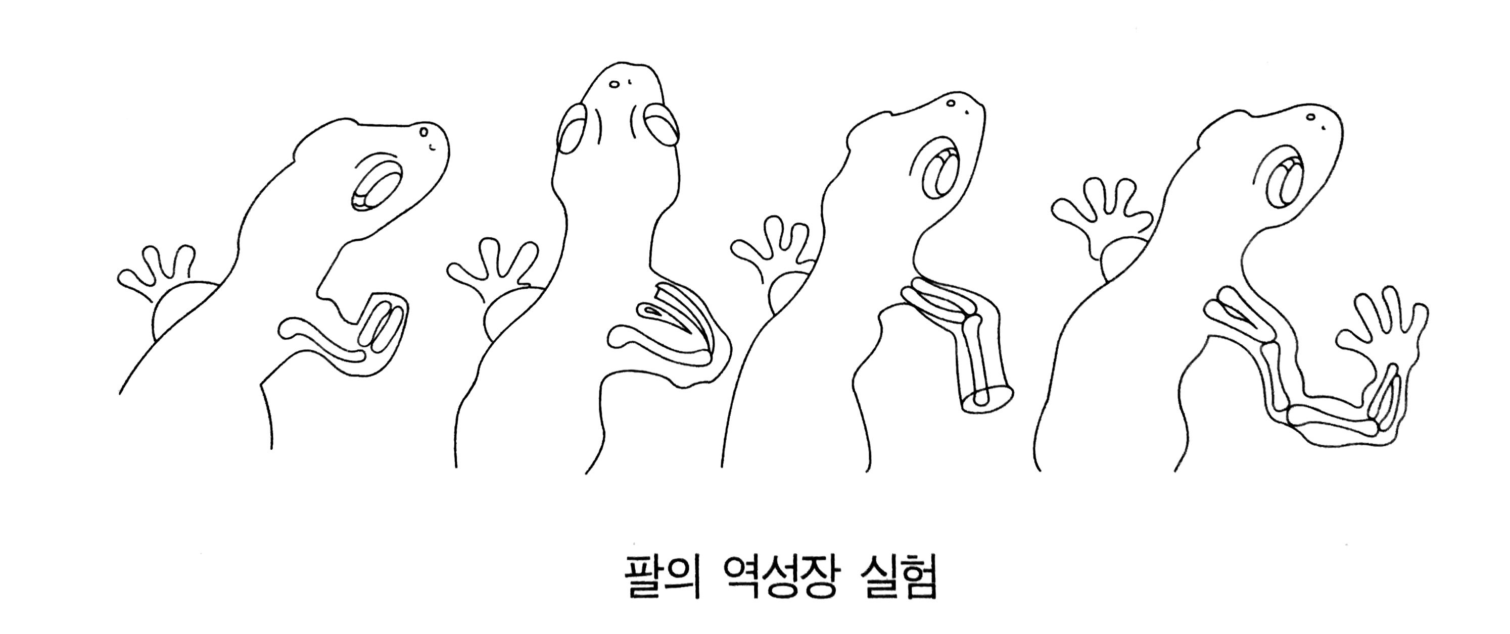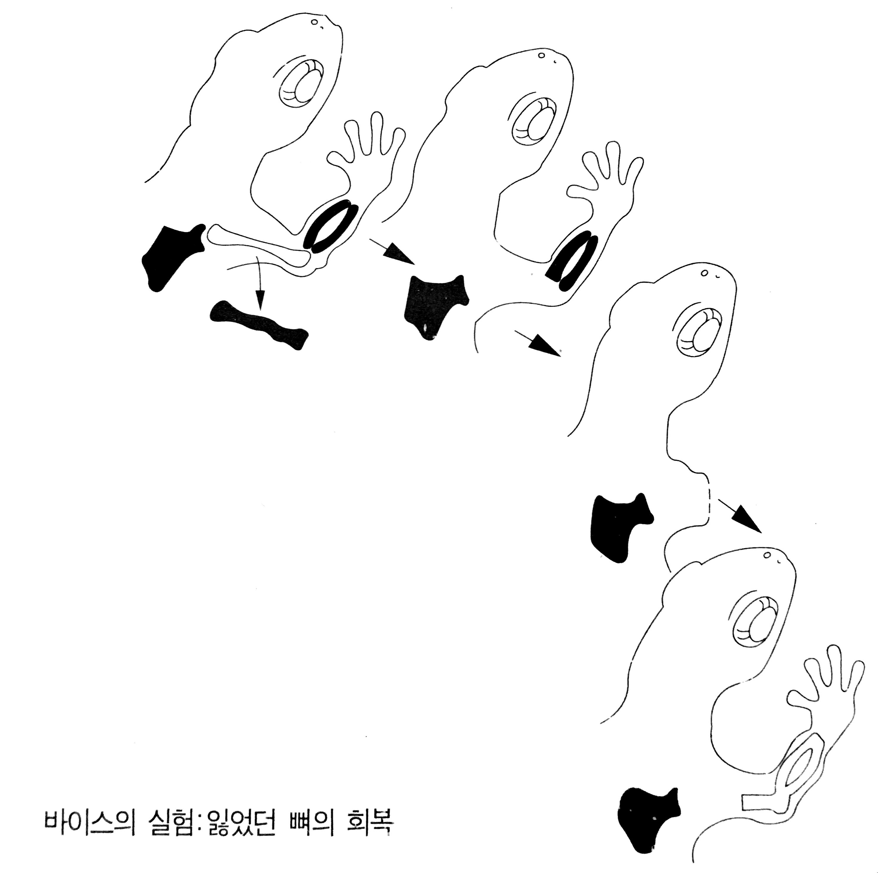 다른 하나의 고전적 실험이 문제를 분명히 하는 데 도움을 준다. 도롱뇽의 손(앞다리)을 절단하고 절단된 손목 부분을 몸에 꿰메어 붙인다. 손목은 몸 속으로 성장해 들어가 신경과 혈관들이 새롭게 연결된다. 팔은 U자 모양의 해괴한 모양이 되었고, 양쪽 끝이 모두 몸에 붙어 있다. 다음, 어깨 부분을 절단하여 거꾸로 된 팔을 만드는데, 그 팔은 손목이 몸에 붙어있고 끝이 어깨 연결 부분이 된다. 그러면 그것은 마치 단순히 어깨에서 절단된 것처럼 재성장한다. 결국 팔은 다음 그림과 같은 모양으로 완성된다. 손목이 몸에 붙어 있고 아래 팔뚝, 팔꿈치, 윗팔뚝, 그리고 어깨, 이어서 새로운 윗팔뚝, 팔꿈치, 아래 팔뚝, 손목, 그리고 손의 순서이다. 어째서 재생은 전체의 균형잡힌 몸 형태에 가까워지도록 진행되지 않고 이미 만들어진 절차를 따르는 것일까? 도대체 통제 요소는 무엇인가?
