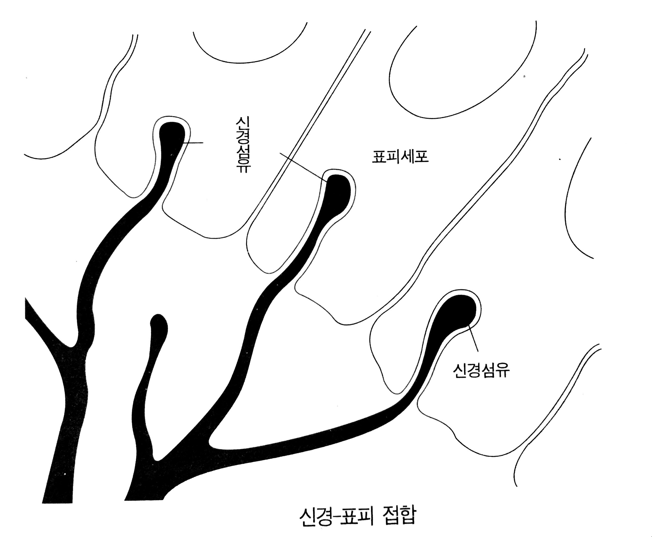 그로부터 얼마 지나지 않아서, 뉴욕 코넬 의과대학에서 연구하고 있던 해부학자 엘리자베스 헤이는 신경-표피 접합을 전자현미경으로 관찰했다. 그녀는 각 신경섬유 다발이 절단 부분에 도달하면서 여러 갈래로 갈라져 표피 속으로 스며들어간다는 것을 발견했다. 각 신경섬유는 그 끝에 조그만 공 같은 것을 형성하여 표피세포막에 침투시키고 자리를 잡는다. 그 배열은 마치 신경세포의 연결부인 시냅스와 같았다.