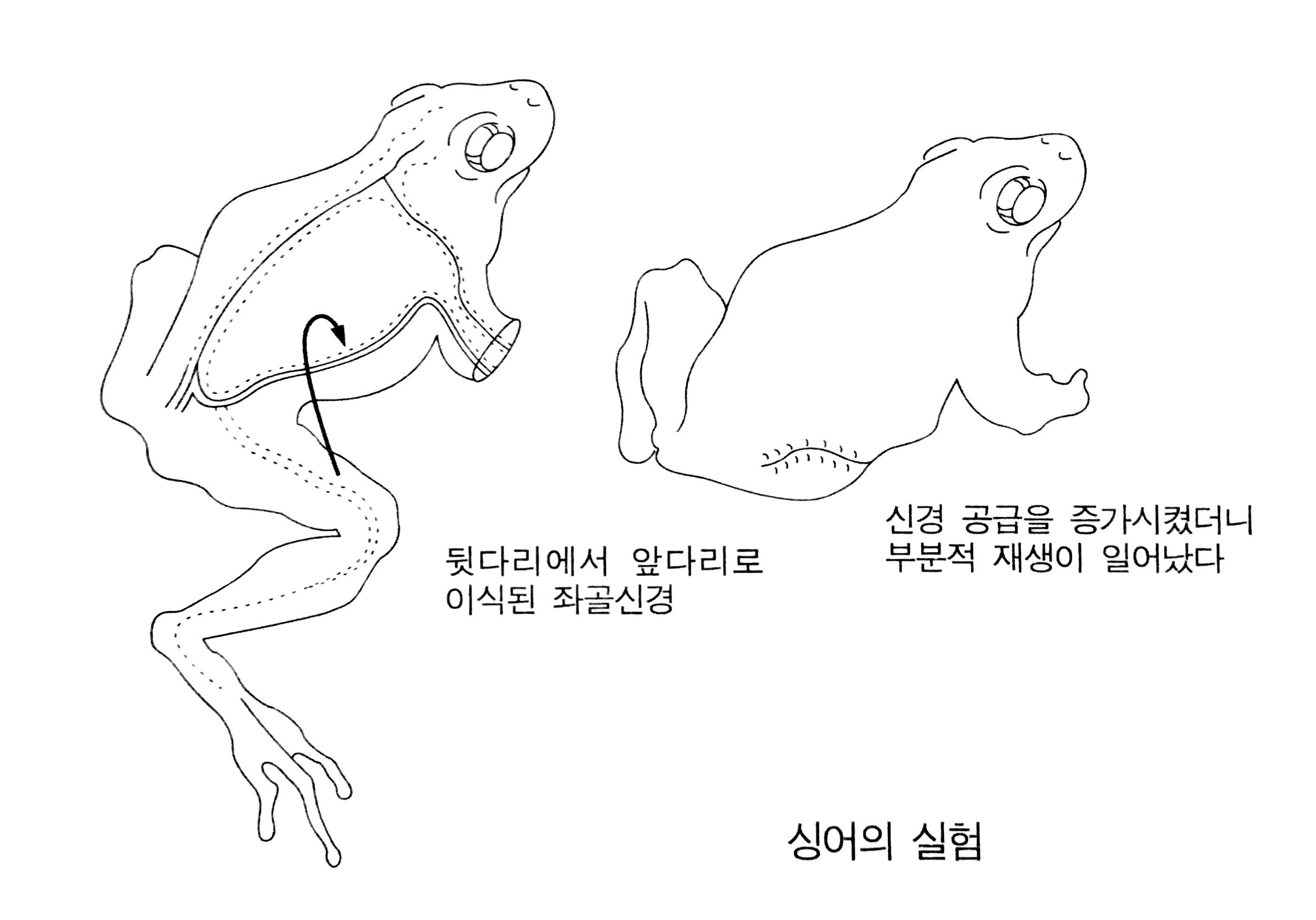 그러나 그것은 그렇게 간단하지가 않았다. 남아메리카산 개구리인 크세노푸스는 다른 개구리들에는 없는 재생 능력을 갖고 있는데, 그 다리의 신경섬유 숫자가 한계에 훨씬 못미치고 있었다. 그래서 싱어는 뉴런의 크기를 측정해 보았는데, 크세노푸스는 재생 능력이 없는 개구리들보다 훨씬 큰 뉴런을 갖고 있었다. 일련의 다른 실험들이 그 관계를 명백히 했다. 정상적인 신경조직의 약 30퍼센트가 한계 질량으로서, 재생이 지속되기 위해서 남아 있어야 하는 양이었다.