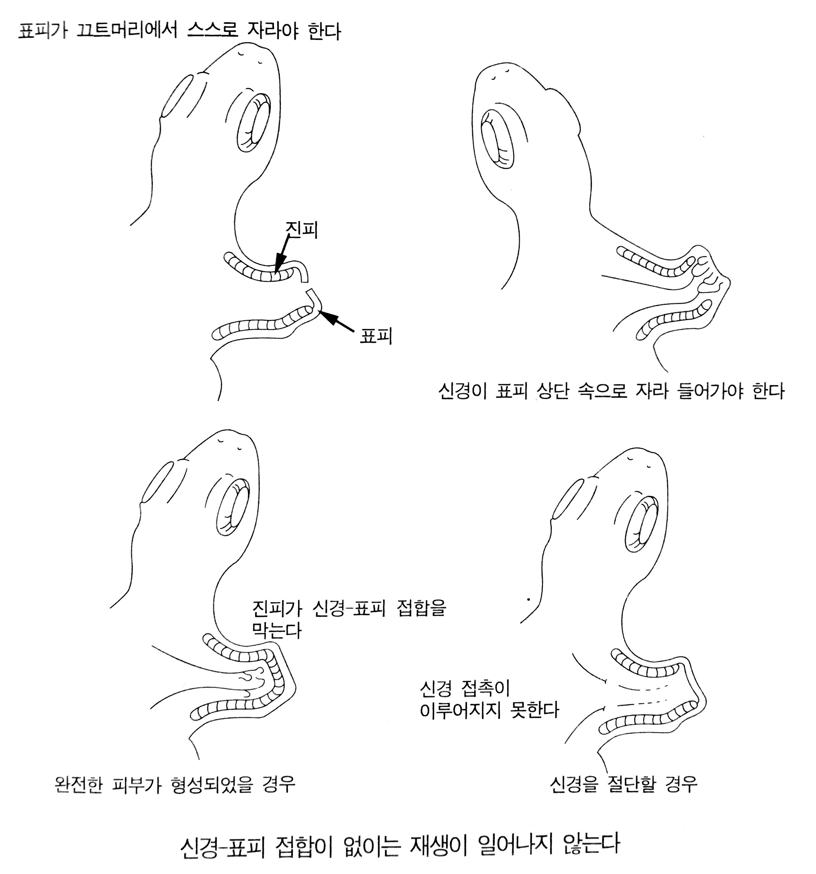나중에 다른 연구자들이, 진피가 없는 상태의 꼭대기 모자가 재생에 있어서 대단히 중요한 역할을 한다는 것을 보여 주었다. 그것은 재성장하는 신경섬유가 아체가 나타나기 전인 재생의 첫번째 단계에서 표피세포와 독특하게 연결되기 때문이었다. 이 연결들은 신경-표피 접합이라 부른다. 미시간 주립대학의 찰스 손턴은 일련의 정밀한 실험에서, 도롱뇽의 다리를 절단하기 전에 그 신경을 여러 차례 절단하고는 신경이 재성장하는 것을 관찰했다. 다리의 재생은 신경ㅣ 표피에 도달한 후에야 시작되었고, 둘 사이에 어떤 장애물이 있으면 중지되었으며, 장애물에 조그만 틈이라도 있으면 재생이 진행되었다. 1954년까지 손턴은 신경-표피 접합이란 아체가 형성되어 재생이 시작되기 전에 일어나야만 하는 핵심적인 과정임을 증명했다.
