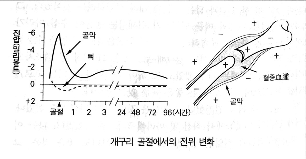 전기적 변화들은 복잡했지만 모든 골절에 있어서 거의 같았다. 거기에는 두 가지 구별되는 패턴이 있었는데, 하나는 골막의 패턴이고 또 하나는 뼈의 패턴이었다. 골절 이전에는 뼈와 골막 모두 발목 쪽 끝은 무릎 쪽 끝에 비해 1밀리볼트 이하의 작은 음 전위를 갖고 있었다. 골절이 발생하자 골절 위 다치지 않은 골막 위의 전위는 6 또는 7밀리볼트까지 뛰었고, 반면에 골절 아래 위로 양 전위 지역이 형성되었다. 일주일 후에, 발목 쪽을 향한 정상적인 골막 전위가 회복되었다. 골절시 골막을 다쳤을 경우에는, 그것의 음 전위는 7밀리볼트보다 위로 뛰었다. 그러나 부러져 매달려 있던 다리를 절단했을 때에는 즉각적으로 극성이 역전되어, 개구리에 대한 나의 첫번째 재생 실험에서처럼 절단 부분으로부터 양의 전류가 만들어졌다. 뼈 자체는 골막과는 달리 단시간의 전기적 변화를 보였다. 처음 한 시간 동안은 부러진 양쪽 끝에 약간의 양 전하가 나타나다가, 세 시간 후에는 거의 0으로 떨어졌다.