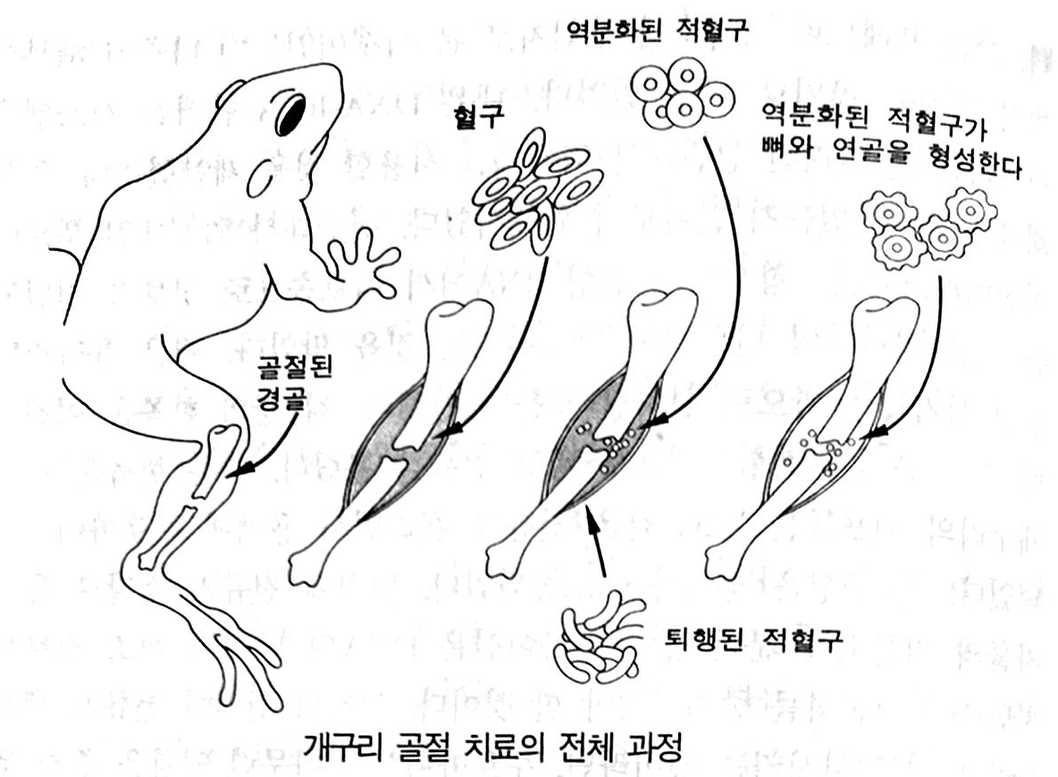 몇 종류의 동물들에 있어서는 골막세포가 상처 치료 전류에 반응하여 골절 부분으로 이동하고 뼈세포로 좀 더 특화한다. 이 과정은 양서류에 있어서는 고온 환경에서만 해당되고 포유류에서는 눈에 띄게 나타나는 과정이다. 포유류의 두꺼운 골막세포는 적혈구 핵의 부재를 보상해 준다. 이때쯤 인간의 뼈 치료에 있어서 골수 성분이 핵이 있는 미숙한 적혈구나 다른 세포의 역분화에 관여하고 있다는 것을 확신하게 되었다.