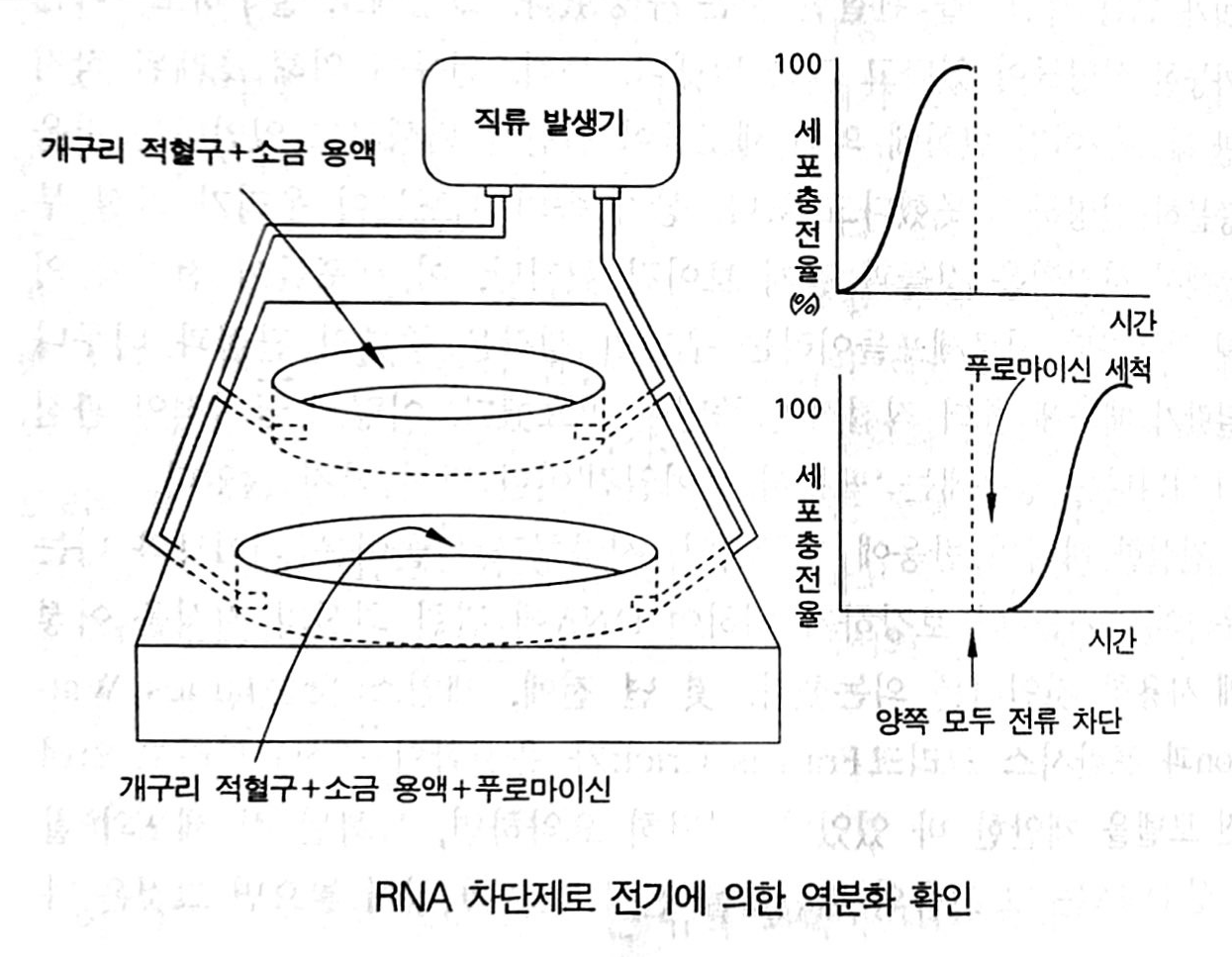 과연 푸로마이신 속의 세포들은 변환을 일으키지 않았다. 다음에 댄은 푸로마이신 속의 세포들을 맑은 물에 몇 번 담가 푸로마이신을 씻어 내자고 제안했다. 그것들은 전류를 흘리지 않았음에도 신속히 역분화했다. 전류는 항생제가 있음에도 불구하고 분명히 유전적 변화를 일으켰고, 유전자들은 자물쇠가 풀린 채로 머물러 있다가 푸로마이신이 제거되자 완벽하게 시스템을 작동시켰던 것이다.