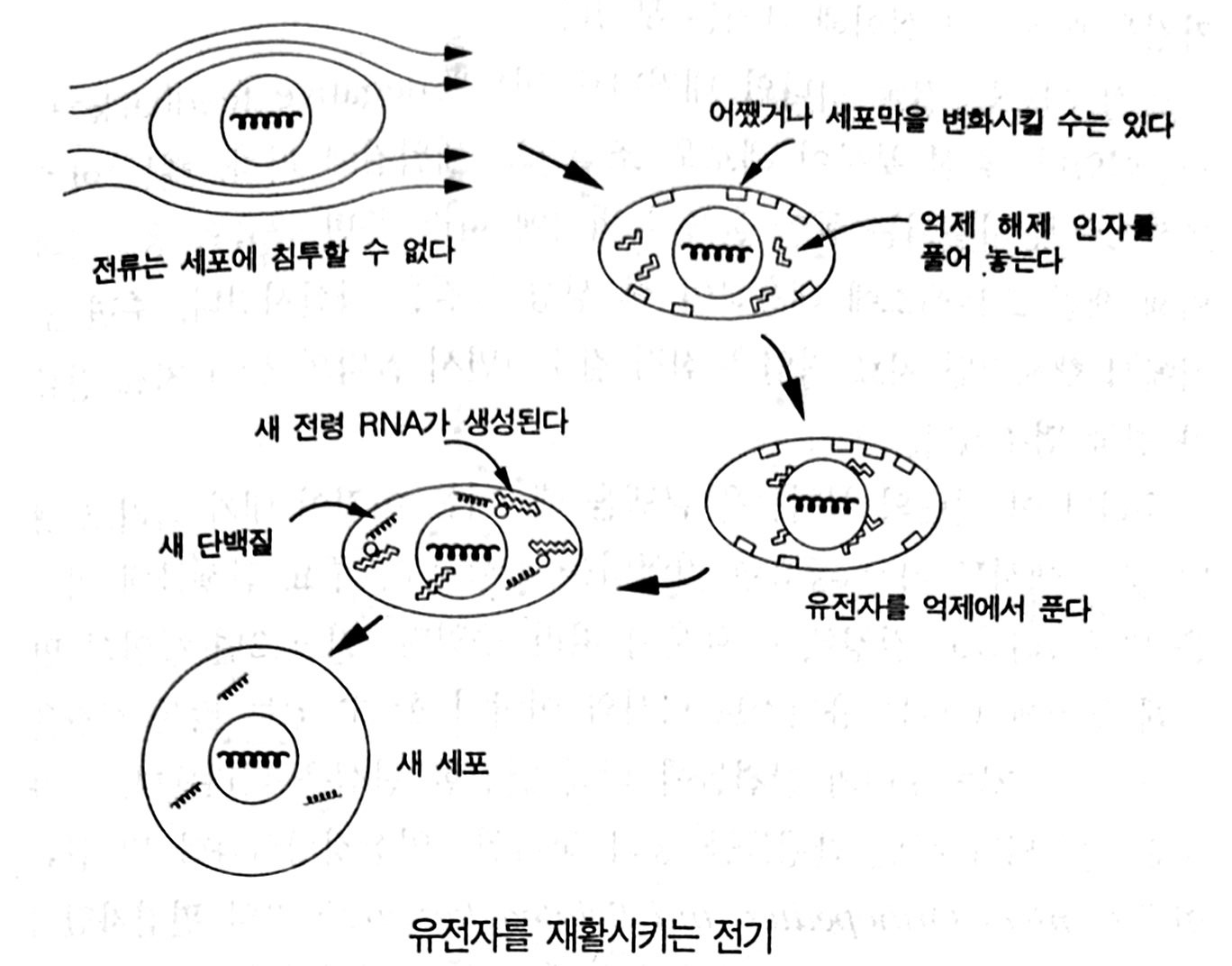 전기적 힘은 억압되어 있던 유전자를 풀어 주는 열쇠임이 판명되었다. 그러나 그 열쇠의 정확한 성질은 여전히 신비로운 부분이 많았다. 핵은 절연체인 세포막과 세포질로 둘러싸여 있기 때문에 전류가 직접 작용할 수는 없었다. 우리는 전류의 일차적 영향이 세포막에 가해져야 한다는 것을 알았다. 세포막 그 자체도 전하를 띠고 있는 것으로 알려져 있었다. 그 전하는 아마도 전하를 띤 분자의 특정한 패턴을 결정하며, 각 종류의 세포마다 다른 듯했다. 우리는 세포막이 억제 해제 인자를 내놓는다고 가정했다. 그 억제 해제 인자들이 핵으로 이동하여 유전자의 스위치를 켜는 것이었다. RNA의 구조에 관한 최근의 발견들에 기초하여 억제 해제 인자는 전령 RNA의 안정된 형태를 갖고 있을지도 모른다고 추론했다. 정보 RNA는 세포가 성숙하여 핵이 소멸된 후에도 고집스럽게 생존해 있다고 가정했다. RNA 분자는 접힌 상태에서 전자 결합에 의해 오랜동안 안정된 상태에 있을 수 있다. 만약에 접힌 RNA 분자들이 모든 세포막에 저장되어 있다면 미소한 전류일지라도 그 결합을 풀어 놓을 수 있을 것이었다. 이 가정을 아직까지 실험해 보지는 못했다.