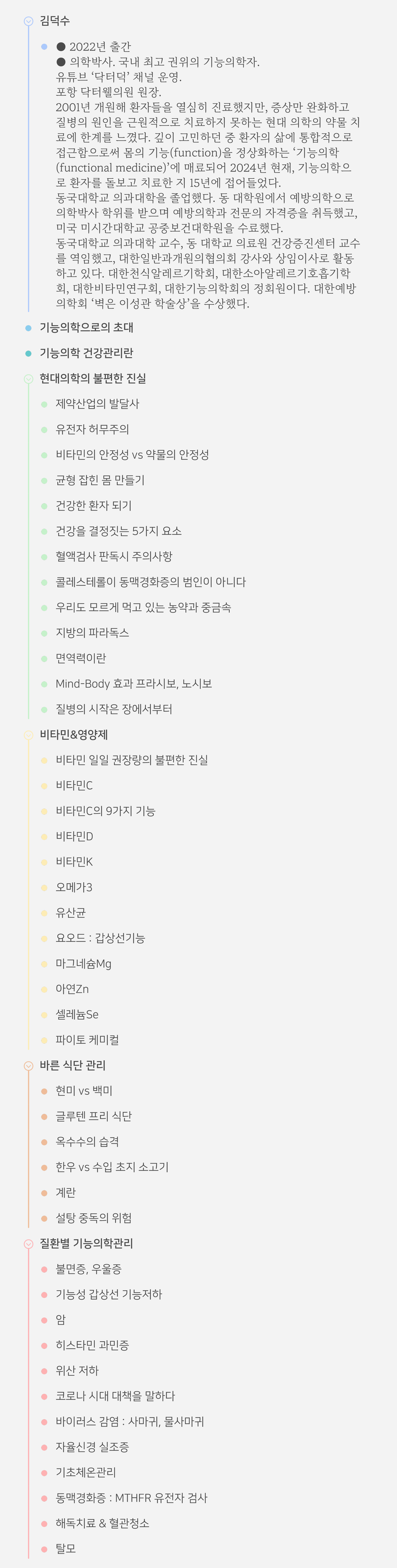 위키피디아에서 찾아본 기능의학 설명에 따르면 질병의 원인을 통합적으로 본다고 하는데, 이 책의 저자는 주로 몸 속 성분으로 접근한다. 몸 안에 존재해서는 안될 중금속, 환경호르몬, POPs(잔류성유기오염물질) 등등은 빼주고, 필수 요소인 각종 비타민, 미네랄 등등은 채워주는 방식이다. 각종 성분들이 어떻게 몸 속에서 기능하는지 알 수 있는 책이다.