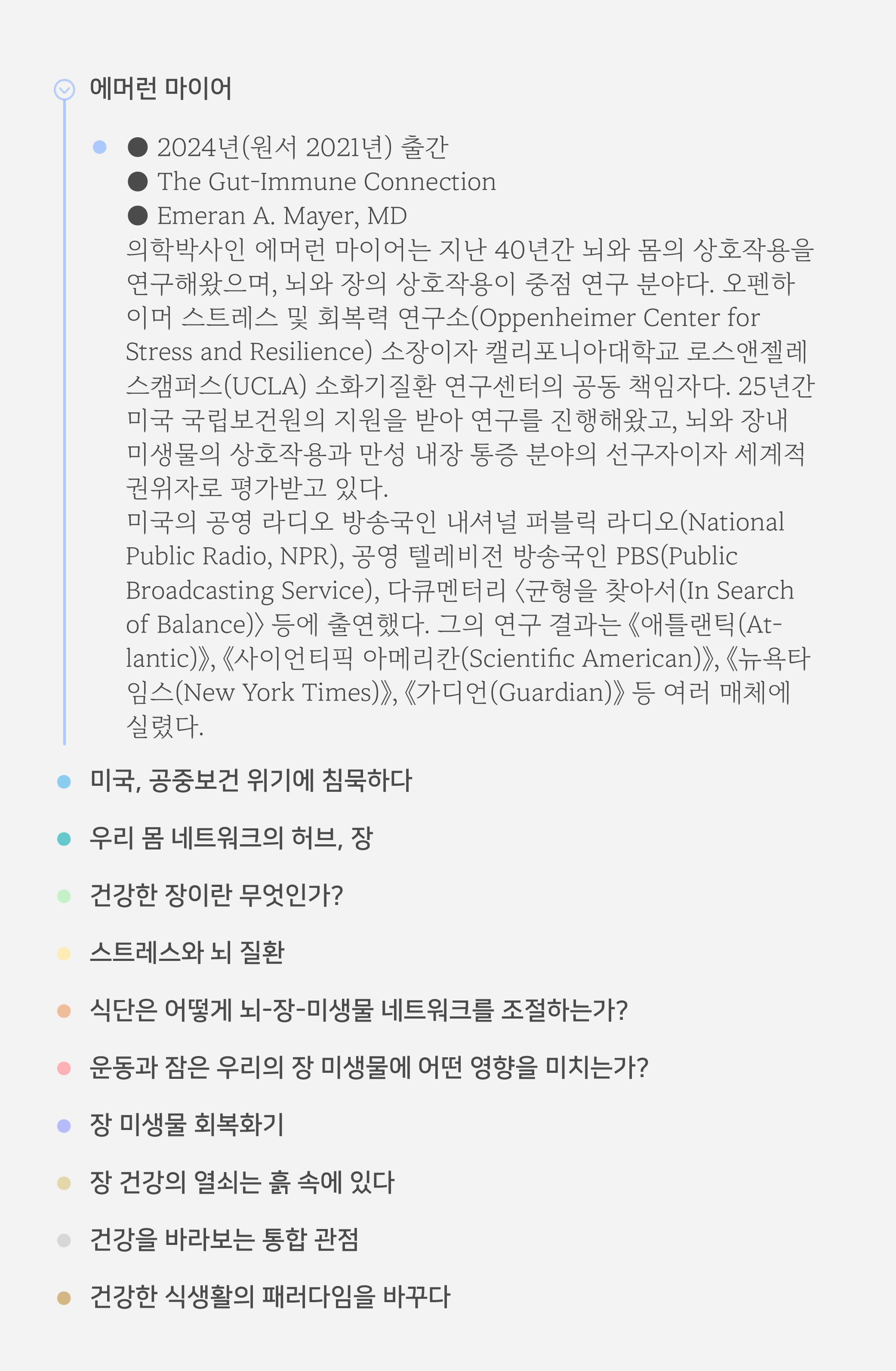 인간 수명 100세 시대를 맞아 현인류는 그 어느 때보다 오래 산다. 동시에 그 어느 때보다 아프다. 심혈관계 질환, 당뇨병, 대사 증후군, 자가면역 질환, 암, 간 질환, 우울증, 알츠하이머병 같은 만성질환이 놀라운 속도로 늘고 있다. UCLA 의대 교수이자 저명한 소화기내과 전문의인 에머런 메이어 박사는 장 미생물이 우리 몸을 위협하는 질병의 중심에 있다는 획기적인 제안을 내놓는다. 최신 과학과 임상 경험을 결합한 이 책은 21세기 건강 위기에서 벗어나려면 우리 몸을 뇌-장-미생물 네트워크의 장으로 바라보는 새로운 접근 방식이 필요하다고 말한다. 장 미생물과 신체 시스템 사이에 잘못된 신호가 오가면 질병에 취약해질 수 있다. 결국 우리가 식습관을 통해 장에 사는 미생물 생태계를 어떻게 유지하느냐에 따라 우리 몸의 건강과 질병의 드라마는 달라질 것이다.