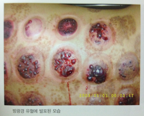 - 딱지가 지고 난 후 자국이 남는다. 젊은 사람들은 몇 개월 만에도 없어지는데 나이가 많을수록 자국이 오래간다. 많이 아파서 치료가 길어질수록 자국이 오래간다. 길게는 1~2년까지도 갈 수 있다. 전에는 고소하겠다는 말까지도 나왔다. 흉터를 꺼리는 분은 발포요법을 신중히 생각한 후에 하는 것이 좋다.